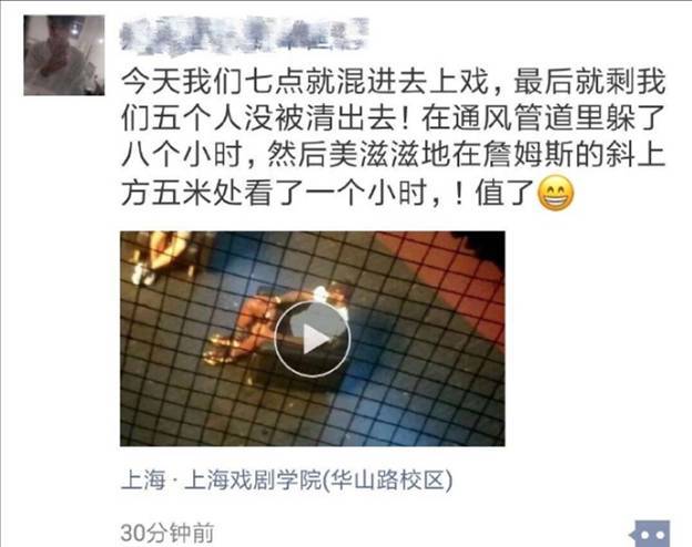 2018年詹姆斯中国行上海站期间,詹姆斯曾造访上海戏剧学院。有球迷晒出自己在活动现场五米高的通风管道里躲了八个小时,只为见老詹一面。
