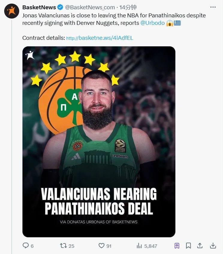 欧媒BasketNews报道,消息源称,征战了13个赛季的瓦兰丘纳斯即将离开NBA,加盟希腊豪门帕纳辛纳科斯!帕纳辛纳科斯给瓦兰开出了3年1200万欧元的合同。而瓦兰现有的NBA合同仅有25-26赛季是保障合同,金额为1040万美元,26-27赛季是非保障合同。瓦兰可能会寻求买断自己的合同,从而加盟帕纳辛纳科斯